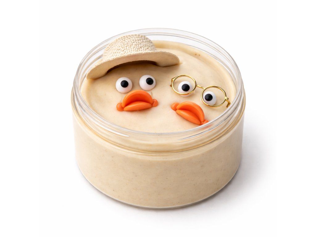 Jemná modelína s detaily, ze kterých může vzniknout veselá kachnička s kloboučkem a brýlemi.