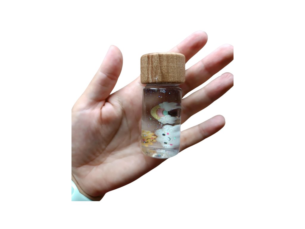 Naplněná glycerinovým roztokem, v němž pomalu plují třpytky, plastové sluníčko, mráček a duha. Tekutý obsah pomáhá zklidnění, soustředění a zrakovému vnímání.