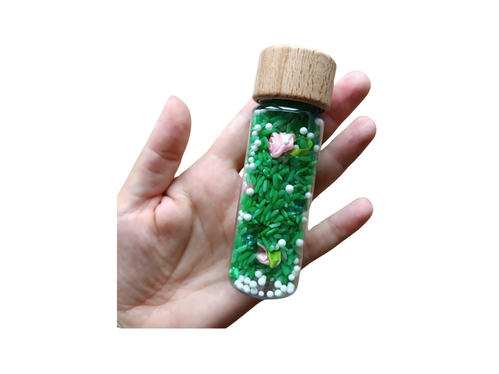 🌸 Senzorické lahvičky "Jaro" – objevte probouzející se svět plný barev a jemných kontrastů. Děti sledují, jak v sypké lahvičce šustí zelená rýže jako tráva, mezi kterou se třpytí kapky rosy a padají kvítky. V té tekuté zas plavou květy a lístečky v zlatavém pylu. Dokonalý trénink pozornosti i smyslů – a přitom tak klidný a magický.