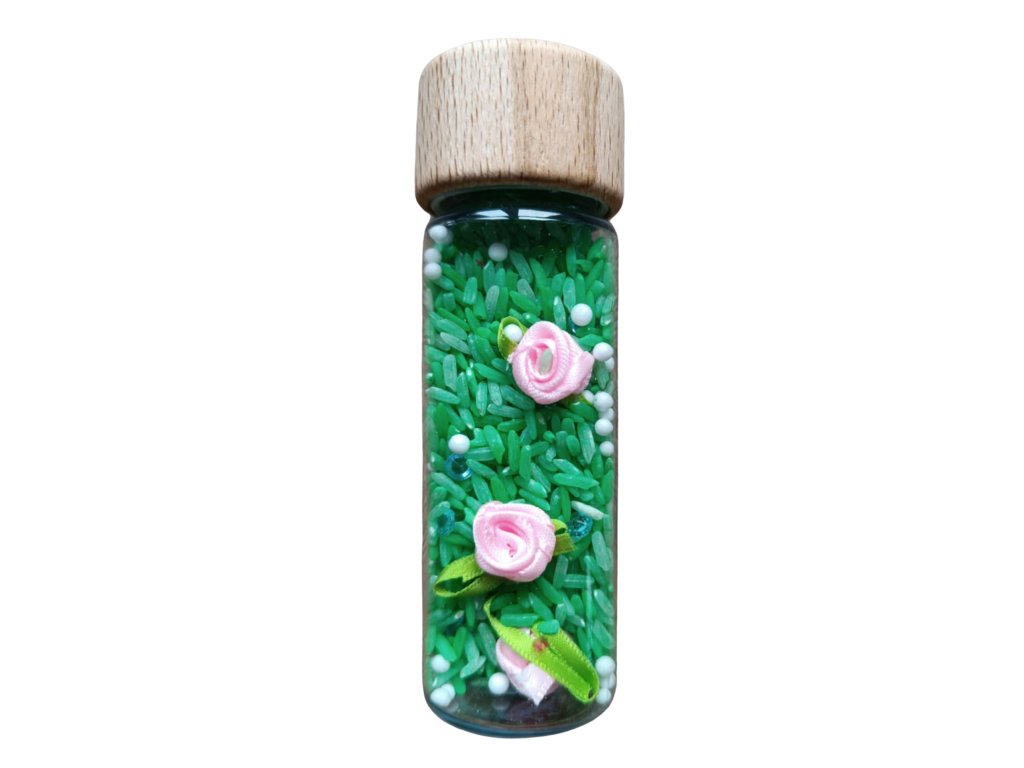 Zelená rýže jako čerstvá tráva, modré kamínky evokující kapky rosy, bílé polystyrenové kuličky připomínající spadlé okvětní lístky a jemné růžové květy. Děti láká ke sledování, třesení a poslouchání.