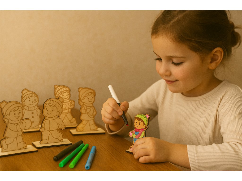 - › Dřevěné výřezy s motivy zimních radovánek (sněhulák, koulování, stavění iglú, jízda na saních aj.).